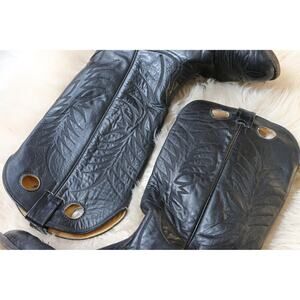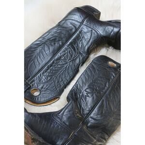 Staple 1970's cowboy boots in men's size 8-1/2 to 9 (wide) or women's 10 to 10-1/2. Pull on style with double hole details on the sides of the shaft. Thick block heel and leather soles. Rounded toe. Classic western stitching up the sides of the shaft and tan leather lining. Fabric is a genuine leather in black. In great vintage condition with normal sole wear and tons of life left to the leather.