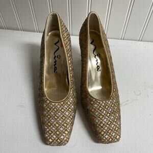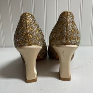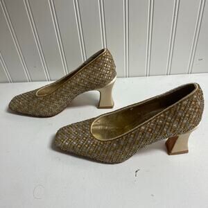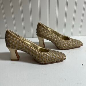 1990s Vintage Nina 5 kitten heel shoe beaded gold silver cream Victorian formal