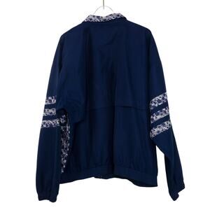 1990s Vintage Navy Blue Windbreaker Jacket. Retro Vintage Track Jacket with Embroidered Logo and Patterned Areas.