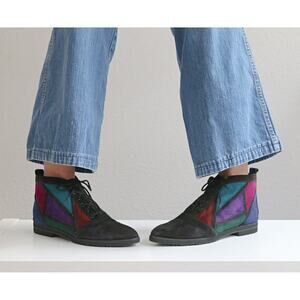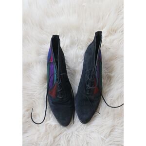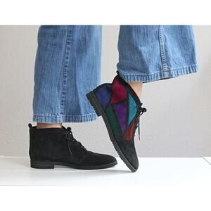 1990's Short ankle boots in women's size 8-1/2 to 9 Slim. Unique color block shaft in deep, bold jewel tones trimmed in black. Leather lined and lace up shaft. Slim almond shaped toe. Fabric is a genuine suede leather. In excellent vintage condition with no major wear.