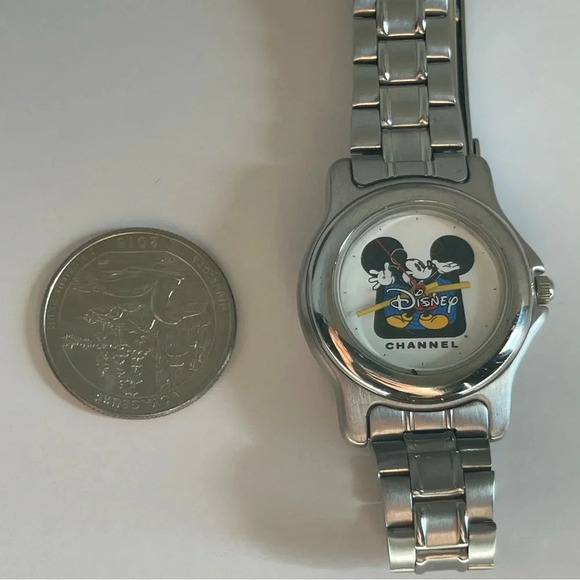 wonderful Disney watch, featuring Mickey Mouse and the Disney Channel logo. The crystal is clear and free of scratches, and the case is in good condition, with light wear. The silver toned link band is in good condition, with light wear. The watch runs well and keeps time.