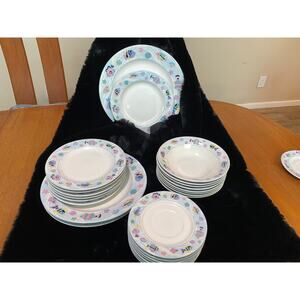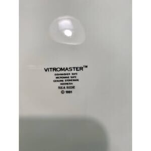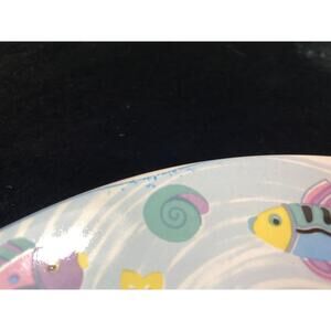 These 3 dinner plates were made in Indonesia by Vitromaster in their Sea Side pattern. The china pattern features solid white pieces decorated with little tropical fish in pastel blues, greens, purples, pink, and yellow swimming around the inner edge of the rim. Marked as dishwasher and microwave safe. These plates measure about 10 3/4" diameter. Other pieces of this dinner set are being sold separately, but if you wish to purchase other items, I will give you a discount for reduced shipping.