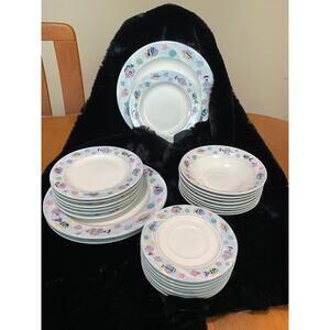 These 7 (plus 1 slightly chipped on bottom) saucers were made in Indonesia by Vitromaster in their Sea Side pattern. The china pattern features solid white pieces decorated with little tropical fish in pastel blues, greens, purples, pink, and yellow swimming around the inner edge of the rim. Marked as dishwasher and microwave safe. These plates measure about 6 1/4" diameter. Other pieces of this dinner set are being sold separately, but if you wish to purchase other items, I will give you a discount for reduced shipping.