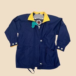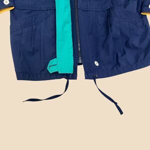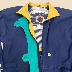 Vintage nautical jacket manufactured by Braefair Sport in the 1990s. Navy blue with bright teal and yellow accents. The jacket zips up and buttons, and has large pockets on both sides. The jacket has small shoulder pads on the inside (i.e., you cannot cut them out without sewing knowledge).