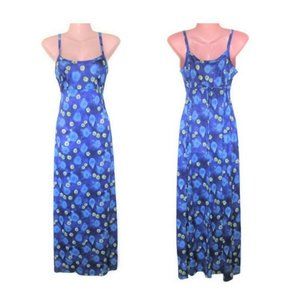 NO HAGGLING length-54,bust-34,empire waist-28,hips-38 stretch long rose flowers yellow daisy daisies sunflowers green sleeveless summer spaghetti straps navy boho hippie hippy retro empire high waisted neon print printed rave raver festival 90s vtg plur photorealistic 1990s vintage grunge blurry ombre blue floral maxi slip dress size extra small xs 4 6 summer trendy hipster festival