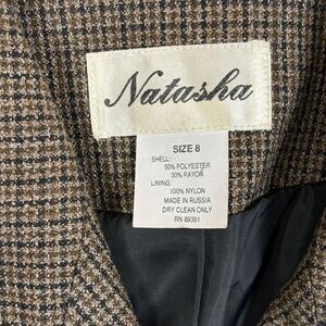 Vintage womens plaid/check blazer jacket, manufactured ca. 1990s by Natasha. Button-down jacket with a brown, black, and beige plaid/check pattern, featuring two exterior pockets. Size 8.