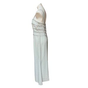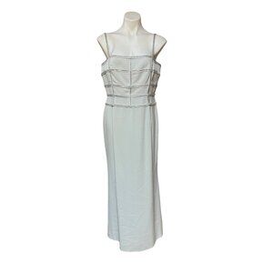 This stunning 1990s/Y2K Vintage Maxi Dress from Daymor Couture is a glamorous choice for a special occasion. The Herve Leger styled gown showcases a silver and gray color scheme with a caged beaded pattern. Made from triacetate and polyester, it's size 12 which seems to run small.