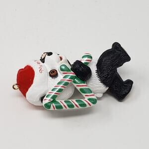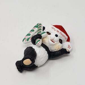 1991 Hallmark Child’s Fourth Christmas Ornament. This Christmas tree ornament features a panda holding a “4” shaped candy cane.