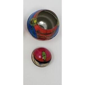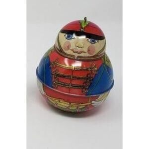 Christmas Solider printed on a pressed tin container - remove twist top head for a hallow inside. Perfect for hiding treats or small gifts on the tree or for a fun morning Christmas game of where's Jolly Wolly.
