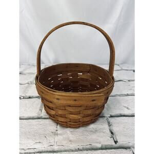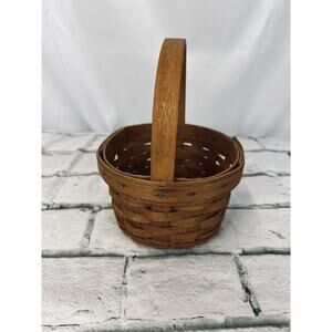 This Longaberger Discovery Basket from 1991 is a beautiful addition to any room. With its round shape and small size of 5.5 inches in length and width, and 3.5 inches in height, it is perfect for any occasion. The American style basket is made of woven wood in a stunning stained brown finish. This handmade basket features a stationary handle and is perfect for collectors, especially since it is now retired. The care instructions for this item are to clean it with a damp cloth. It is an original piece from the late 20th century, specifically 1991, and was produced in the United States using the weaving production technique. This item is sold as-is and does not require any additional parts.