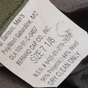 Authentic 1991 U.S. Marine Corps men’s garrison cap in green poly/wool blend, size 7-1/8, manufactured by Bernard Cap Company under contract DLA100-91-C-0407. Features the original USMC Eagle, Globe & Anchor (EGA) insignia affixed to the left side. Constructed to MIL-C-3261B specifications with reinforced stitching and internal lining. NSN 8405-01-279-7658 confirms official issue. Ideal for collectors, reenactors, or uniform restoration. Excellent used condition with minimal signs of wear.
