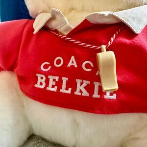 Vintage 15 inch ‘92 Coach Belkie White Teddy Bear With Whistle, Hat, Shirt and Original Tag