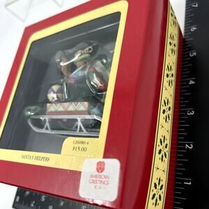 1992 Vintage Carlton Cards Heirloom Collection Christmas Santa's Helpers Ornament in Original Box. Squirrel and Bear on Sled with Gifts, Ball and Wreaths.