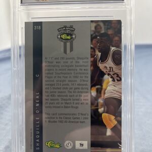 The product is a 1992 Classic sports trading card featuring basketball player Shaquille O'Neal, specifically card number 318 from the All-American set. Manufactured by Classic Games, Inc., this graded 6.5 card showcases O'Neal during his early years in the 1992 season. As a sought-after collectible in the sports trading card market, this card holds value for fans and collectors of basketball memorabilia.