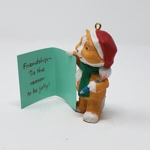 1992 hallmark friendly greetings Christmas ornament. This ornament features a kitty cat holding a christmas card. there is prewritten messages on the cover and the first inside page, but the second inside page is customizable to add your own personalized message. This has never been displayed and was unboxed for photos. Approx dimensions: 3" tall