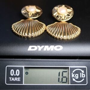 Kenneth Jay Lane created these "Royal Sea" earrings, for Avon, which are a bright gold tone, featuring a sand dollar design with a pearl in the center and a stunning bold shell dangling below. These pieces are exquisite and they're extremely comfortable. They measure 2.5"L, have new pads and are in excellent vintage condition. They match the Royal Sea Necklace in our boutique and would be perfect for vacation or make an excellent gift! Signed 'K.J.L. for Avon'.