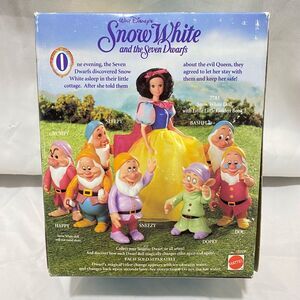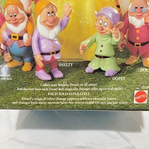 Vintage 1992 Mattel Disney Snow White and The 7 Dwarfs Bashful Doll Magic color change. Very clean and new condition. No major damage or stains that we saw at all. May have Some light wear to packaging from storage but still in good unused condition.