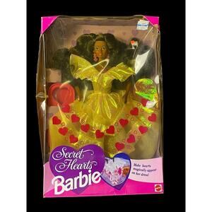Add a touch of magic to your collection with this 1992 Secret Hearts Barbie Doll from Mattel, item #3836. This vintage Collector Edition features Barbie in a bright yellow gown with pink heart designs and long curly dark hair. Her dress reveals hidden hearts when touched with warmth or chilled with ice, bringing interactive charm to classic Barbie styling.