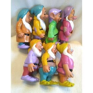 1992 Mattel Walt Disney Snow White & the Seven Dwarfs Gift Set. Manufactured in China. Discover magical color change surprise again & again! Warm water used to make the color change for Grumpy (eyebrows raise), Sleepy (eyes close), & Doc (jewel). Cold water used to make the color change for Happy (dirty face), Dopey (kiss), Sneezy (nose turns red), & Bashful (face turns red). Use the washcloth to change the color, for example, Doc's diamond. Each measure approximately 6" tall & are recommended for ages over 3. Pre-owned condition & show signs of play, such as worn paint. The biggest problem seems to be that their color changing doesn't really work anymore. This is a common occurrence for water changing toys 30 years old. The warm water still works a bit, but the cold water doesn't seem to affect the other 4 anymore. They all twist at the middle & their arms move as they should. You are buying this item AS-IS. Please look carefully at all pictures & ask any questions before purchasing.