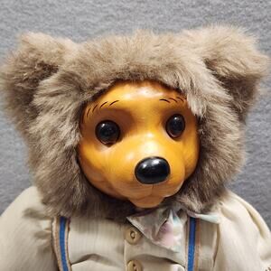 Known for their carved wooden faces and mohair bodies. Dressed shirt, suspenders and corduroy overalls. Limited Edition.