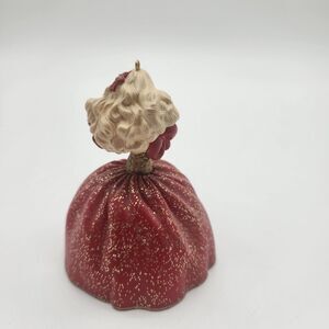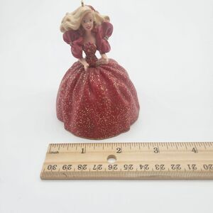 This vintage 1993 Hallmark Keepsake Ornament features the Holiday Barbie Series' first ornament. The red gown and hanging feature make it a perfect addition to any Christmas tree. The ornament stands at 3.5 inches tall and 3 inches wide, with an irregular shape. It is made of plastic and manufactured in China. The ornament is part of the Hallmark franchise and has been well-preserved over the years, making it a great collectible item for any Barbie or Christmas enthusiast.