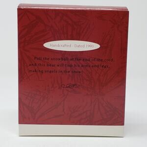 1993 Hallmark Snow Bear Angel ornament. This ornament features A baby bear/cub Laying in the snow making a snow angel.. when you pull the 2 inch string, his arms and legs move. This has never been displayed and was unboxed for photos. approx dimension 3" Tall