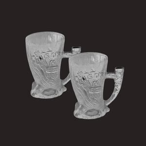 Vintage 1993 McDonald’s Flintstones Movie collectible glass mugs, featuring embossed character and logo details in frosted textured glass. These were part of a promotional release celebrating The Flintstones live-action film. Both mugs have the iconic prehistoric “stone” texture with detailed handle designs and raised lettering.