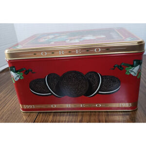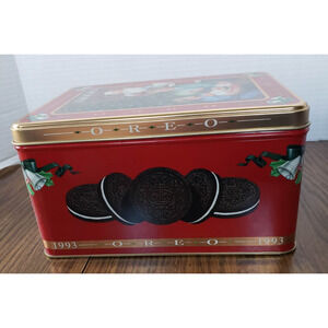 1993 Oreo Cookies Tin Red Unlock the Magic Christmas Morning Santa Tree Vintage