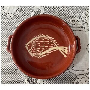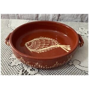 Portuguese Pottery Round Terracotta Red Clay Hand Painted Folk Art Fish