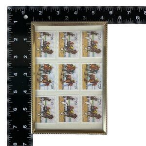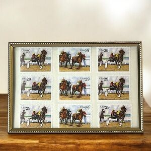 Vintage 1993 Framed US Postage Stamps: Sporting Horses Racing #2757 and Sporting Horses Harness Racing #2758 May 1993 Sheet of 9 unused Stamps in Gold Tone Picture Frame with Non Reflective Glass