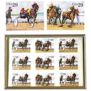 1993 Sporting Horses Harness Racing 29c Stamp Sheet of 9 in Gold Frame Stamp Art