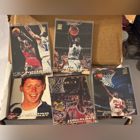 Near complete set - missing 2 , list included, both are commons. Michael Jordan Shaquille O’Neal 358 total cards. Vibrant Topps Stadium Club card. Features bold lettering and classic design. Ideal for collectors.
