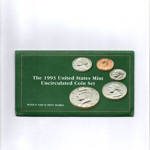 1993-P&D Uncirculated Set... 10 Coin Set... Set Includes (2) Lincoln Pennies P&D, (2) Jefferson Nickels P&D, (2) Roosevelt Dimes P&D, (2) Washington Quarters P&D, (2) Kennedy Half Dollars P&D, and (2) US Treasury Medallions P&D... In Original US Mint Packaging with Spec Sheet... Pre Owned... See Photos... Ships USPS