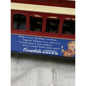 This vintage trolley coin bank features a charming Campbell's Soup design, ideal for collectors or nostalgic decor. Solid die-cast construction.