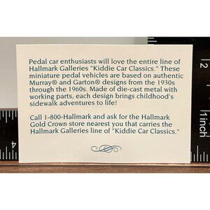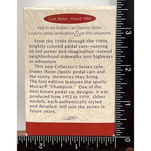 The Hallmark Keepsake Ornament features a meticulously detailed Murray Champion die-cast metal car, part of the Kiddie Car Classics. This 1994 Collector's Series edition is a tribute to iconic pedal cars from the mid-20th century, capturing the essence of childhood nostalgia and craftsmanship.
