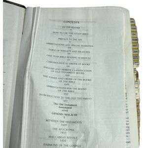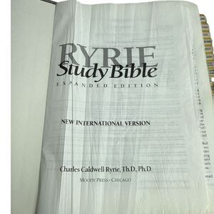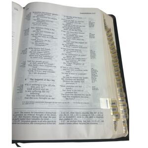 Preowned and gently used. Bonded leather shows expected light shelf wear. Pages clean and unmarked unless noted. Binding intact and strong. A fantastic study and reference Bible!