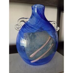 Handblown art glass with silver foil/dichroic inclusions and applied clear handles.
