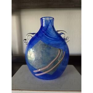 1994 Signed Blue Art Glass Vase 5.5" Cape Cod Studio Silver Foil Accent Signed