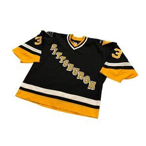 Up for sale is a 1994-95 CCM Pittsburgh Penguins Jim McKenzie #33 Game Worn NHL Jersey Size 56. Fully stitched jersey. Game used wear with stick marks on the jersey. You get exactly what you see in the pictures. Inventory number C2060.