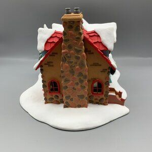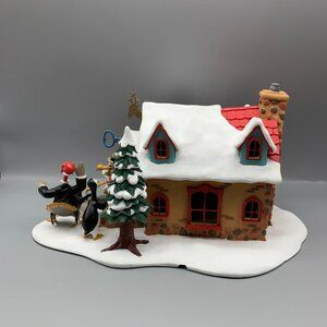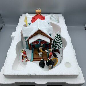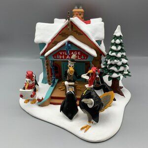 The hall, which features intricate designs and details, would be a perfect addition to any Disney collector or Village display. Made in China in 1995, this contemporary piece is a great way to celebrate the holiday season. It measures just over 5" tall by 6 3/4" wide by 10" deep. The power cord with lightbulb is included in box. The mayor vulture is standing out on the deck with his podium probably getting ready for a press conference. There are penguins that have a camera and others who are recording what is being said or watching. The tom turkey is also listening to the speech. A fun Christmas village lighted building with freshly fallen snow on trees and building. A great piece of Disneyana you can own for your collection. It is in the original box and styrofoam packing.