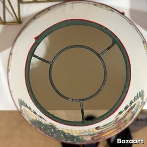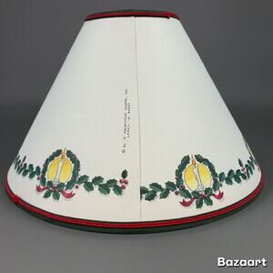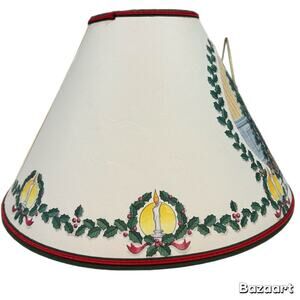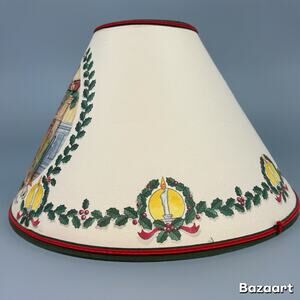 The 1995 Homestead Shoppe Christmas Pierced Parchment Lamp Shade is a vintage collectible with a festive Christmas theme. Made of paper and featuring a multicolor design, this original lamp shade has a bell shape and measures approximately 7" tall with a diameter of 14" at the bottom and 4" at the top. Perfect for adding a touch of retro charm to any holiday decor, this lamp shade from 1995 is a unique and timeless piece that will surely add character to your home. Fireplace themed with Christmas tree. There are tiny holes punched that allow the light to shine through the fire in the fireplace and the candles in the tree and along the lamp shade. There is a wrinkle in the shade (see picture) but it is not a crack and the integrity is not compromised. Beautiful vintage decor piece.