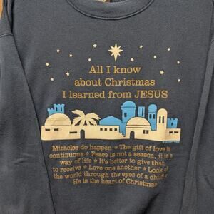 Description: Vintage 1995 Jesus Christmas Crewneck Sweatshirt, front graphic only, blue white and gold, All I know about Christmas I learned from Jesus, Abbey Press, Christian Sweater, Cute, Religious crewneck, Holiday, perfect for Winter, Christianity, God