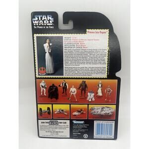 This is a 1995 Kenner Star Wars The Power Of The Force Princess Leia Organa Action Figure. It features a laser pistol and an assault rifle, and is made of plastic. This vintage item is an original and comes in its original packaging, unopened. It is a must-have for any Star Wars fan and collector. The action figure stands at 3 inches tall and is from the TV, Movie & Video Games theme. It was manufactured in China during the 1990-1999 time period and is an authentic piece from the franchise.