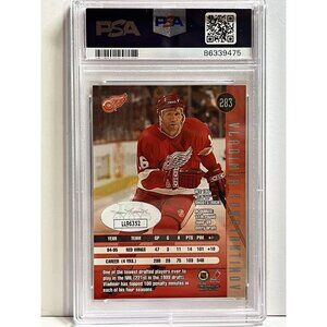For hockey fans and collectors, this 1995 Leaf trading card featuring Vladimir Konstantinov is a must-have item. This original card is double certified from a person who can’t sign anymore unfortunately. It is hand-signed by the Detroit Red Wings player himself, making it an incredibly rare find. The autograph is professionally authenticated by both the Professional Sports Authenticator (PSA) and James Spence Authentication (JSA), ensuring its authenticity.