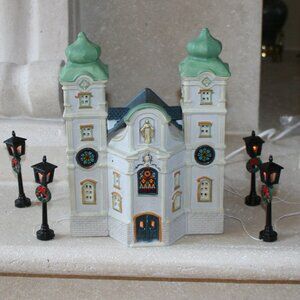 1995 Lemax Dickensvale Porcelain Lighted House with Set of Four Street Lamps.