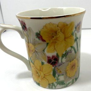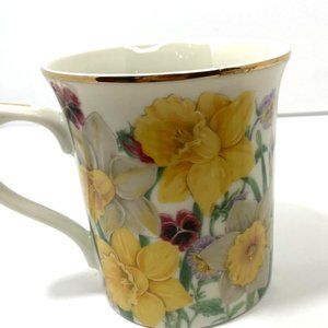 This beautiful 2 piece mug set in Daffodil and Rose by Suzanne Clee from The Flower Blossom Mug Collection Lenox. Each holding 10 oz. Daffodil mug decorated with yellow and white daffodils with peonies in the background. Rose mug decorated with full bloom roses and yellow daisies in the background. Ornate handles with gold metallic trim.