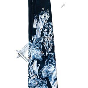 Vintage 1995 World Wildlife Fund necktie featuring a detailed allover print of grey wolves. Design No. 235. Rich naturalistic artwork in shades of blue, gray, tan, and white. Includes informational tag on the back: “Grey wolves live in well-structured groups or ‘packs’ of five to twenty members.”