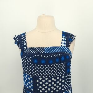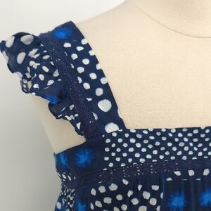 Stylish dress with blue and white polka dot pattern. ruffle, shift silhouette. Features a square neckline and ruffled sleeves.