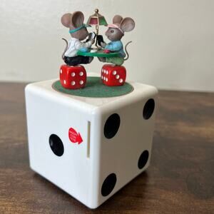 The mice try to keep a poker face as they deal out fun and friendship. You'll be a winner with this mini musical box that revolves on a oversized dice and plays a tune when you insert a coin.