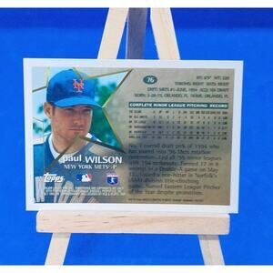 This card is from Topps' first chrome line ever, the 1996 Topps Chrome trading card featuring Paul Wilson of the New York Mets, part of the iconic set labeled as "FUTURE STAR." This card is a parallel/variety with an embossed design, considered a rookie card, and is part of a chase set. Manufactured by Topps, it is made of card stock and metal materials, and is a sought-after collectible for baseball fans and trading card enthusiasts alike. Topps chrome have become one of the most sought after and collectable of the Topps sports cards produced.